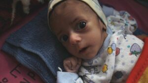 Taqua Tarish’s mother was lucky enough to get a bed for them at the hospital. Taqua is six months old and weighs 2.5kg (5.5lb), which is less than many newborns. Since she was admitted 10 days ago, she has gained only 100g.